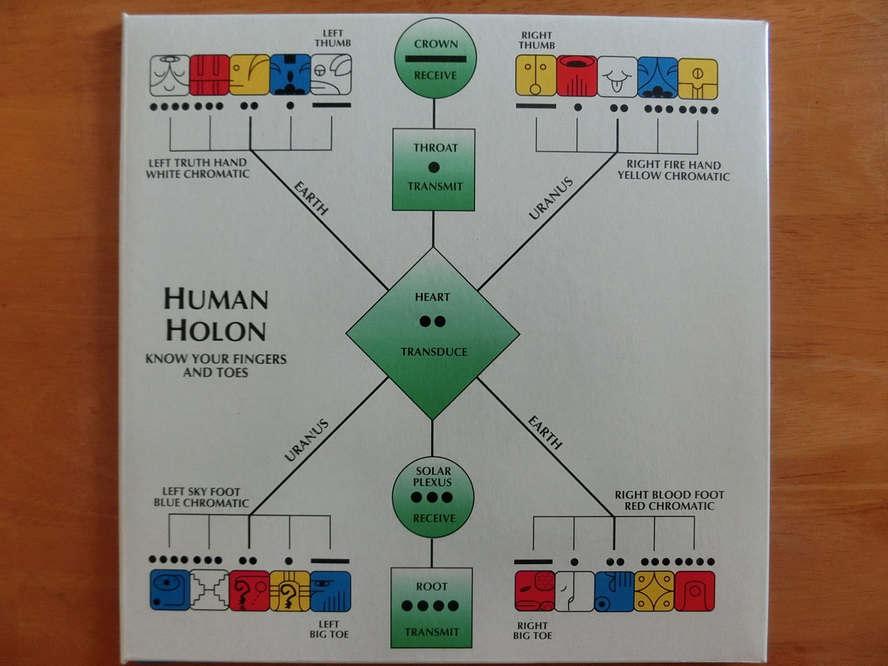 次に手帳P.23の「人のホロン」は手足の指との対応。4つの色彩が4本の腕脚に、そして5つの地球家族が身体の5つのチャクラに対応している。地球と天王星との対応も示されているが、これは中核の地球家族(風、手、人、地球)と惑星軌道との対応であり、『テレクトノン』でピラミッドが置かれる1日(手)と6日(人)が地球軌道、23日(地球)と28日(風)が天王星軌道であることともつながっている。