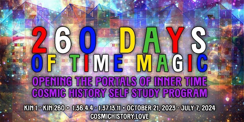 コズミック・ヒストリー自習プログラムKin 1 – Kin 260: 1.36.4.4 – 1.37.13.112023年10月21日 – 2024年7月7日cosmichistory.love260 日間の自習パイロット プログラムは、 Kin 1 (2023 年 10 月 21 日) から、コズミック・ヒストリーサイトのインナータイムのセクションで提供されます。それは2024年7月2日のKin 260で終わります。これにより、青い律動の嵐の年(2024年7月26日)から始まる9年間のビジョンマップの中間点に入ります 。この 260 日サイクルは、Kin 1/自己存在の月4日 (2023 年 10 月 21 日) の参加者向けのライブ ストリームで始まります。リンクはインナータイムに掲載させていただきます。またこの日は、9 年間のビジョン マップの結末である 2029 年 7 月につながる 2080 日の サイバンク サイクルの始まりでもあります。260 x 8 = 2080。私たちは、5 つの時間の城を 260 日間、それぞれ 13 日間の 20 のウェイブスペルで意識的に生きます。全体性の統合に焦点が当てられます。現時点では、コントロールされた物語を超えて、私たちのより大きな目的と使命を意識し続けるために、心、体、精神を規律することが最も重要です。13日ごとに、日々のコードを追跡しながら、コズミック・ヒストリーと時間の法則から異なるテーマに焦点を当てます。自分のペースで進めることができます。各ウェイブスペルの音 1 で、ビデオまたはオーディオが、その 13 日サイクルの主要テーマの説明と概要とともにインナータイムに投稿されます。必要に応じて、瞑想やグラフィックテンプレートも提供される場合があります。それは私たちのテレパシー分野に応じて進化する直感的なプロセスになります。手頃な価格を維持し、すべてのキンが知識を利用できるようにするために、サブスクリプションベースで月あたりのコストをわずか 13 ドルに抑えていることに注意してください。私たちは多言語での翻訳を利用できるように取り組んでいます。この取り組みから利益を得られるのであれば、私たちはあなたのサポートを活用することができます。時間の法則財団への 1 回限りまたは月ごとの寄付を検討してください 。これは私たちがこの作業を継続するのに役立つ、非常に有難いものになります。ご検討をお願いいたします。