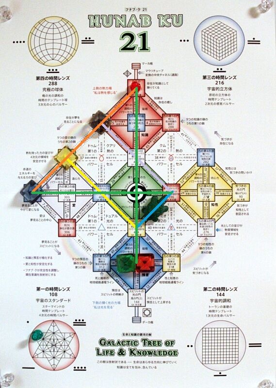 「フナブ・ク21」のヘプタッド・パス28は、黄色い太陽/エンライトゥンド・ワンと赤い地球/ナビゲーターをつなぎ「啓発が舵取りを照らす」。